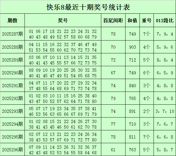 福彩容或8第2025296期开奖转头:07 09 11 14 23 26 31 32 36 37 42 43 48 52 53 54 55 58 64 68,其中奖号首尾间距为61,和值为763,012路比为5:8:7,包含7组同尾号码:11-31、32-42-52、23-43-53、14-54-64、26-36、07-37、48-58-68,开出5个重号:07、23、26、43、53。